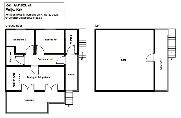 Stairs from the garden leading to a large balcony stretching the length of the house. Concrete flooring and wooden railings. Door to loft area.